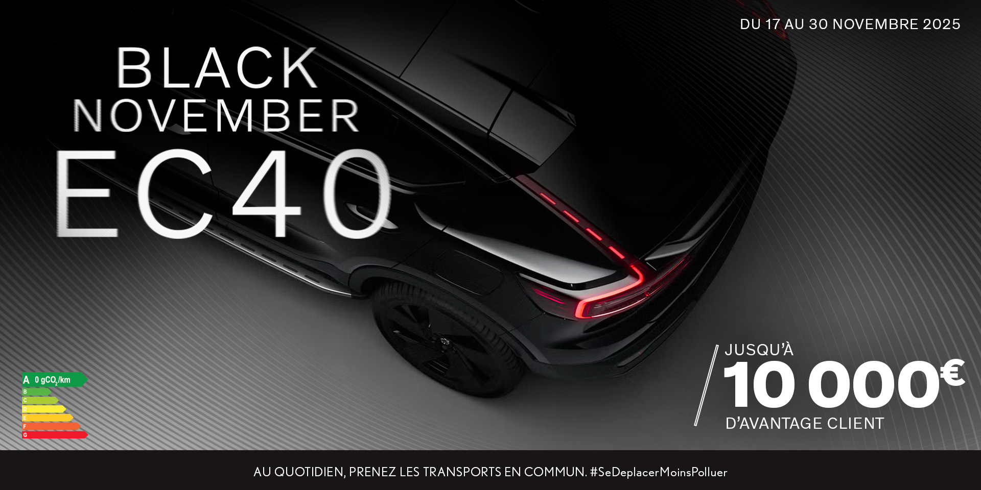 Avantage client Volvo conseillé de jusqu’à 10 000€ TTC sur le prix d’achat d’un VOLVO EC40 BLACK EDITION SINGLE 2WD GEARTRONIC 8 238CH au prix de 66 587.24 euros TTC hors carte grise, hors peinture métallisée du 17 au 30 Novembre 2025. Offre non cumulable avec toute offre de remise/reprise en cours et valable dans la limite des stocks disponibles.